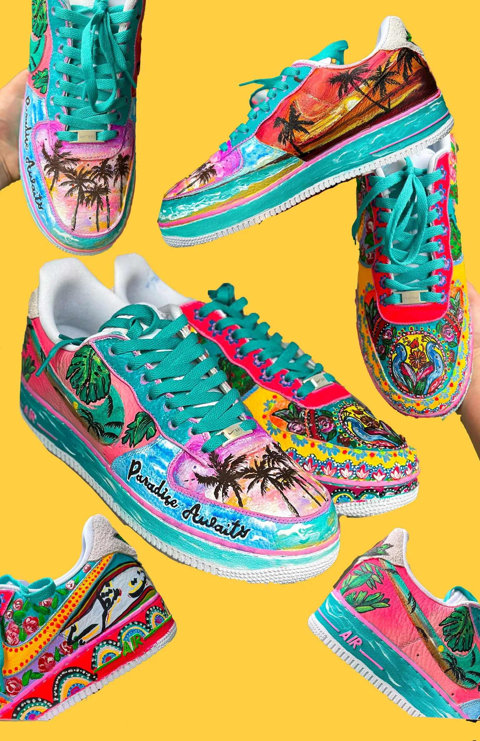 Pakistan x Miami Truck art theme custom painted shoes illustrating Pakatan and Miami. Nike Af1 painted with Angelus leather paint.